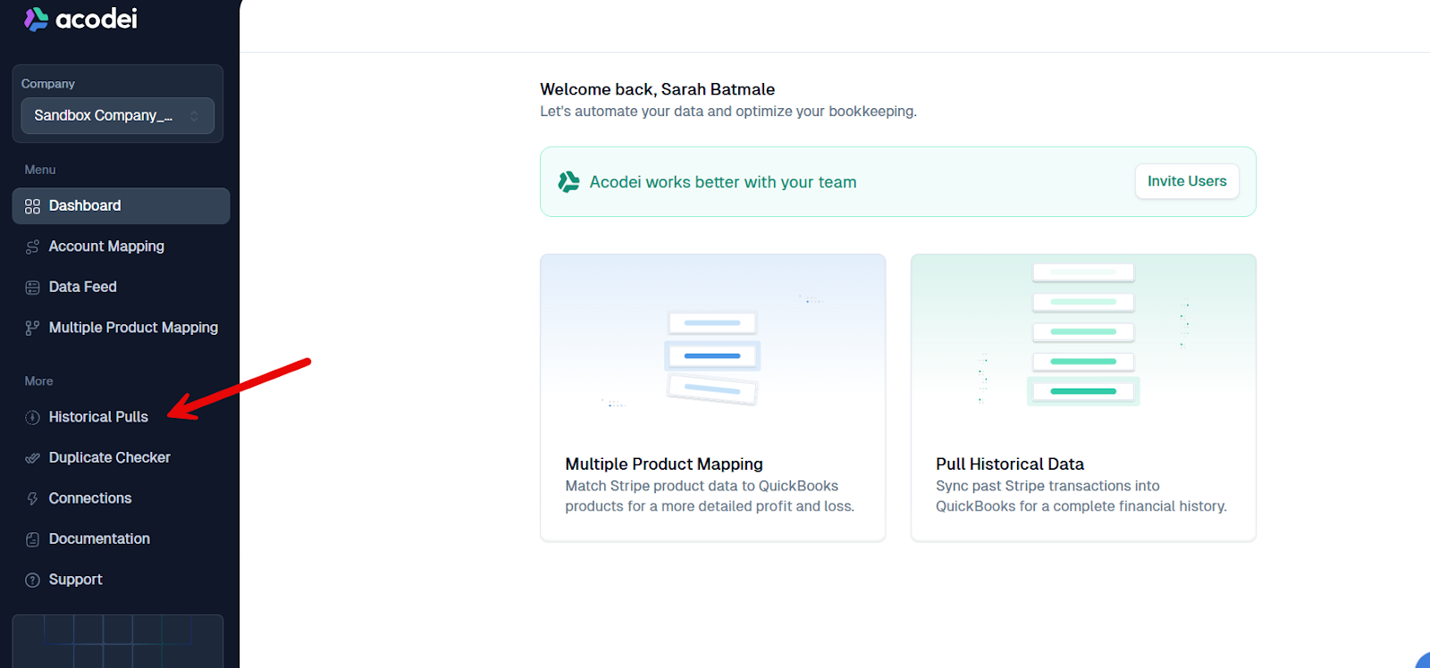 In Acodei, you can retrieve historical data from your account. Before proceeding, please ensure your data looks good in QuickBooks.